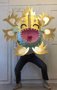 Il ouvre son atelier en 2012, mais à partir de 2013... il semble que le bois, la reparure, le carton-pierre et l'or, éléments spécifiques au bois doré classique, accèdent à une vie propre. Embarquant littéralement dans leur passage poils, ficelles, plumes et autres pompons de laine, tous ces éléments se réagencent alors en masques, en totems carnavalesques foutraques, mi-chic mi-ethniques, très colorés. A moins que ce soient les marionnettes, les Lapins crétins ou les Monsieur et Madame Patate d'un enfant qu'on aurait laissé, en toute confiance, jouer dans un atelier de dorure ?! Un enfant qui s'est lancé aussi dans la confection d'insectes bigarrés.
